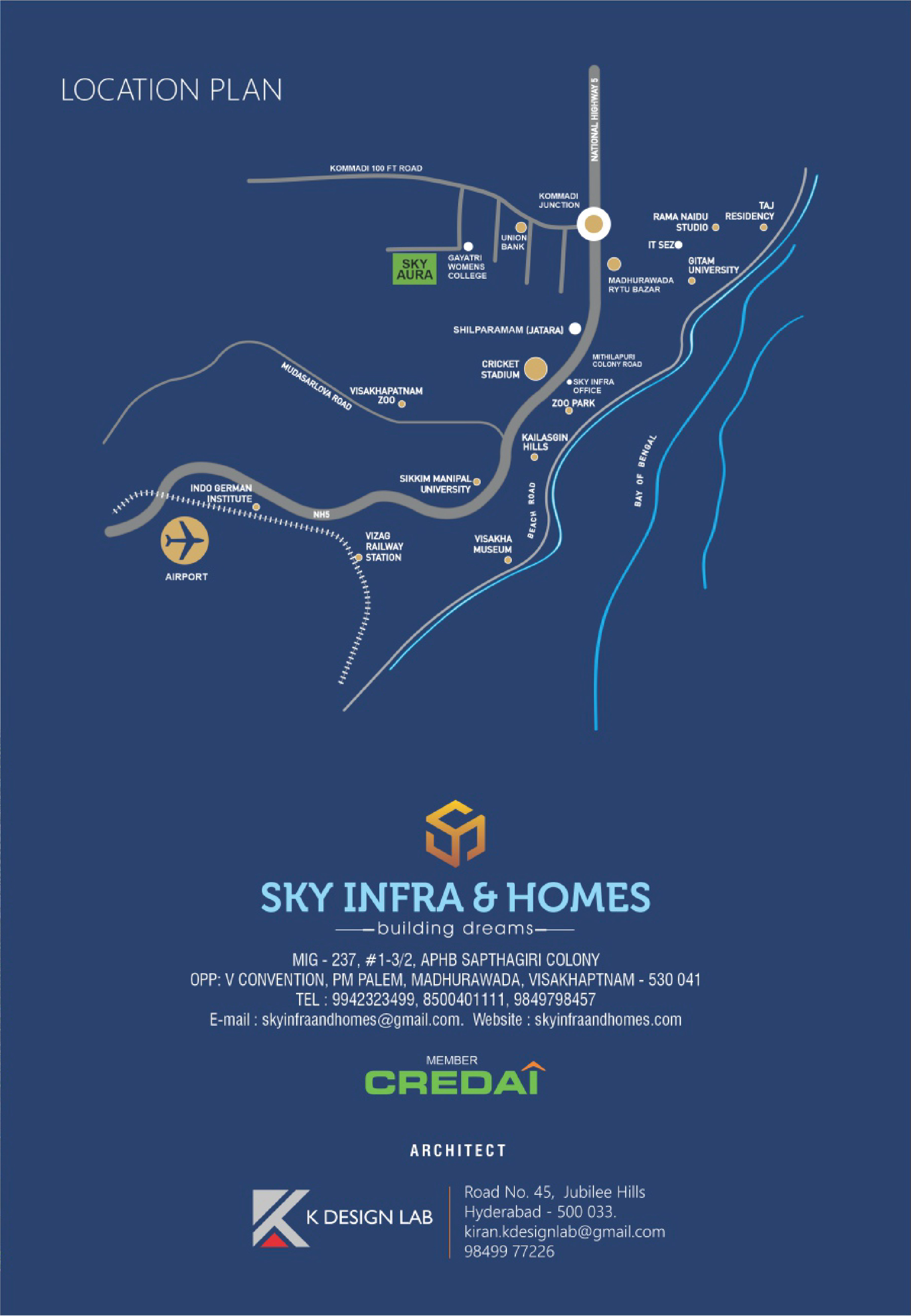 Vizag is a major port city in the state of A.P. Perched in an imaculate location of Kommadi Jn., near Rishikonda is our special residential project- Sky Aura, Vizag Blessed with nature's bounty on all sides, it offeres access to key areas of the city as wel. It finds itself on a serene and peaceful location which means elegance views, abundant natural light and ventilation in every home. Moreover the Sky Infra Projects with a successful track record in Real Estate, presenting youa quality project that deliveryou the happiness in living forever.